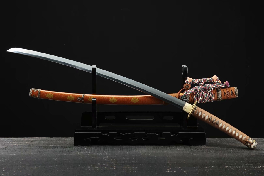 装具:纯铜精雕-古法鎏金银。刀鞘:大漆、刀柄覆鱼皮。刀身:百炼千层钢覆土烧刃04276500。