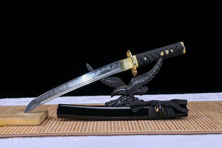 刃材:花纹钢烧刃 鞘材:实木上漆黑亮光鞘