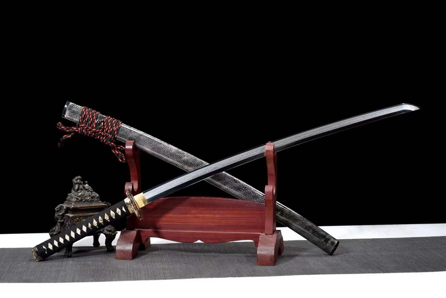 刃材:T10破水烧刃 柄材:拆装鱼皮鞘 鞘拆:全包鱼皮牛角鞘 装具:鎏金银装
