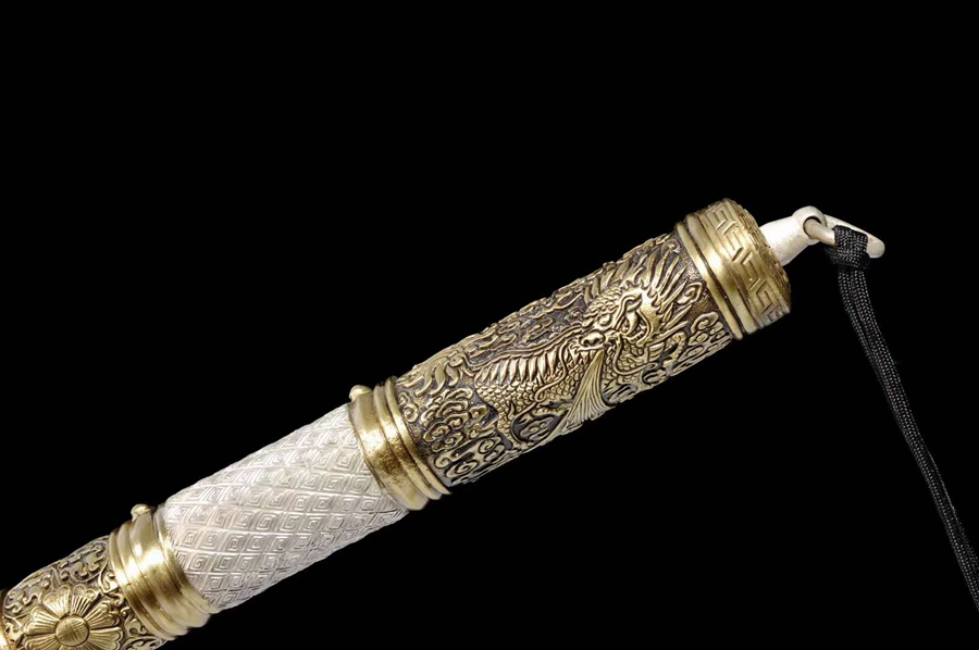 刃材:三枚合夹钢覆土烧刃 装具:纯铜镂空雕刻握柄鎏白银镶嵌松石 鞘材:珍珠鲛鱼皮