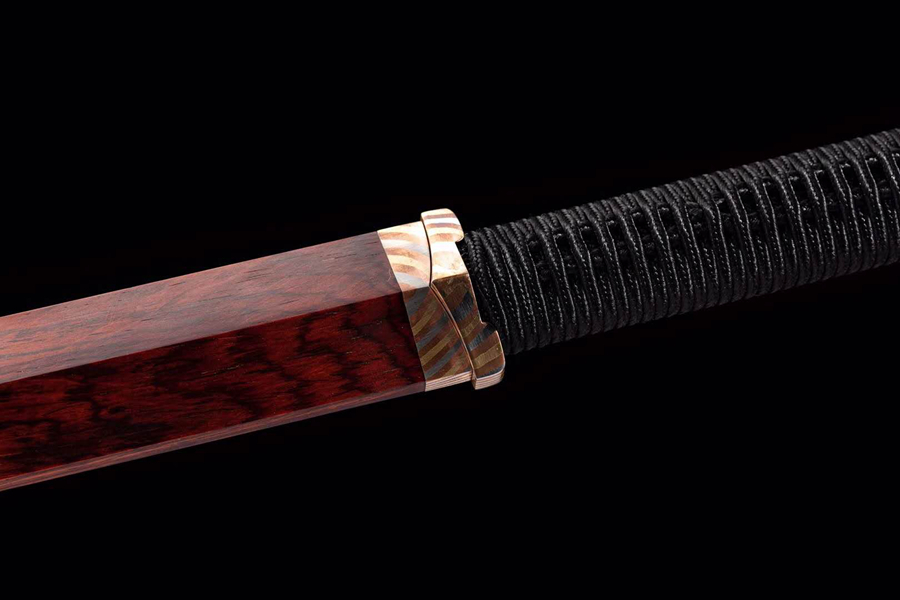 刃材:不锈钢大马士革和毛铁自炼夹钢 鞘材:血檀木 装具:木纹金