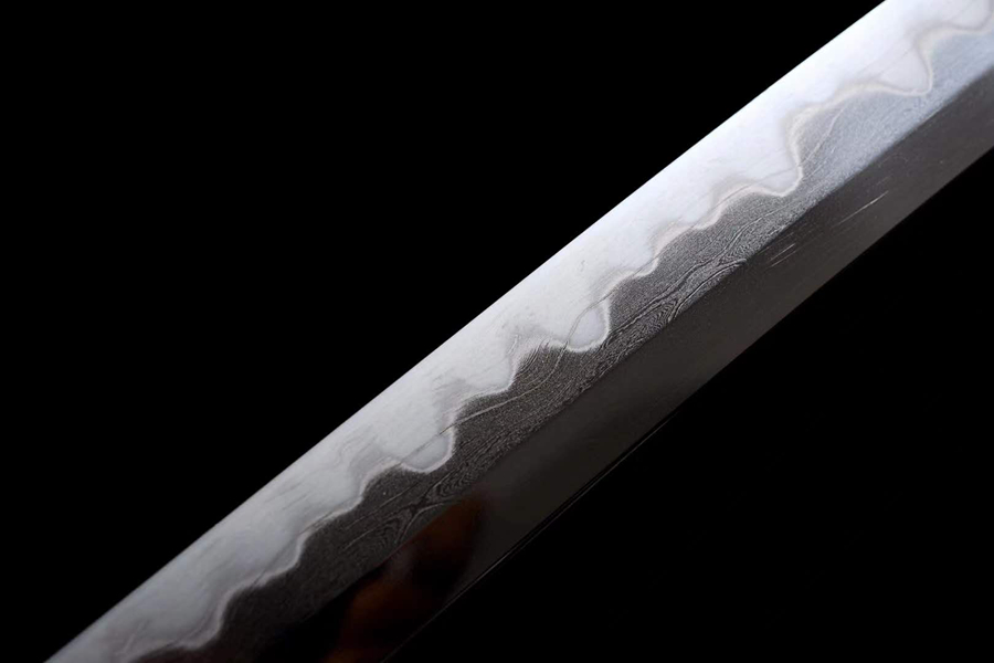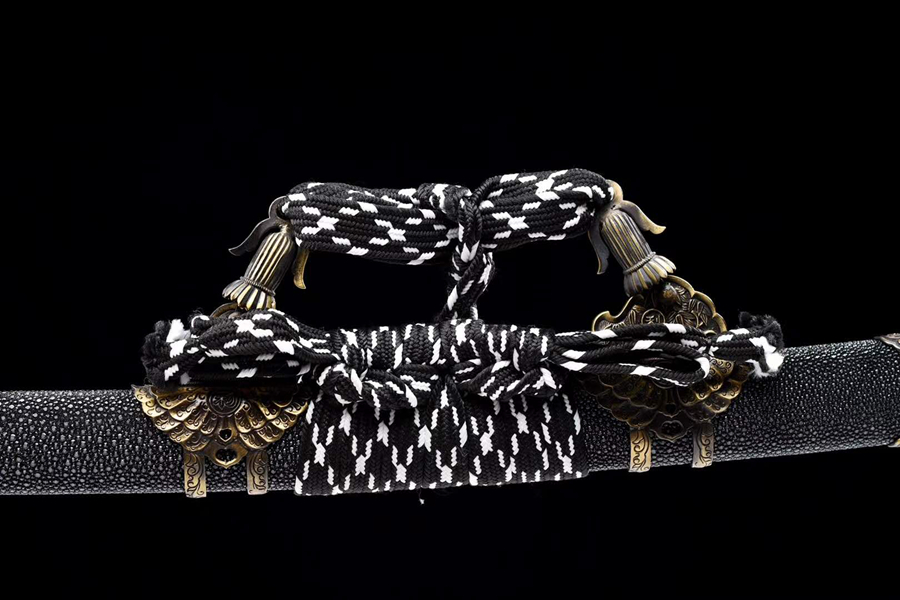 刃材:地肌三枚合锻造 覆土烧刃 手工研磨 鞘材:木胎包珍珠鱼皮 装具:黄铜精雕复古