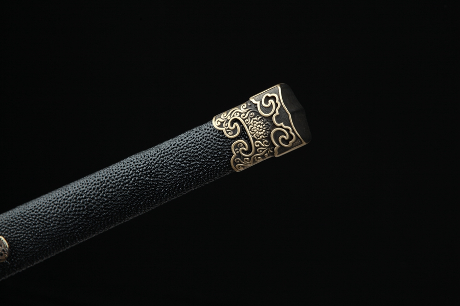 刀鞘:纯铜手工包铜、刻花,将木梢用铜皮包上后起到防潮防湿、禁锢剑装作用、既美观又不会因天气、时间久远而收缩开裂、刀柄包鲨鱼皮高档大气;