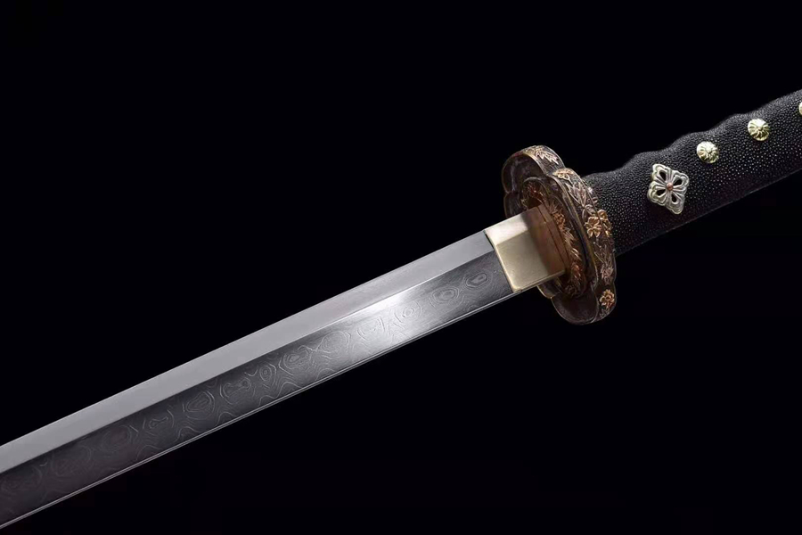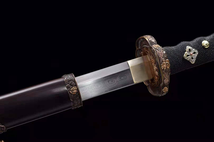 刃材:毛铁手锻钢旋焊纹 鞘材:黑檀木鞘 装具:黄铜鎏金、鎏银