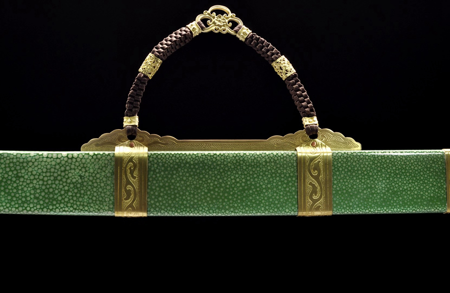 刀身采用纯手工自炼钢古法锻造,经敷土烧刃,手工精细研磨;刀鞘为木胎包珍珠鱼皮;