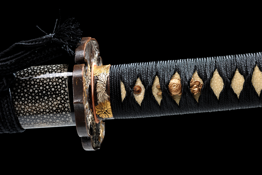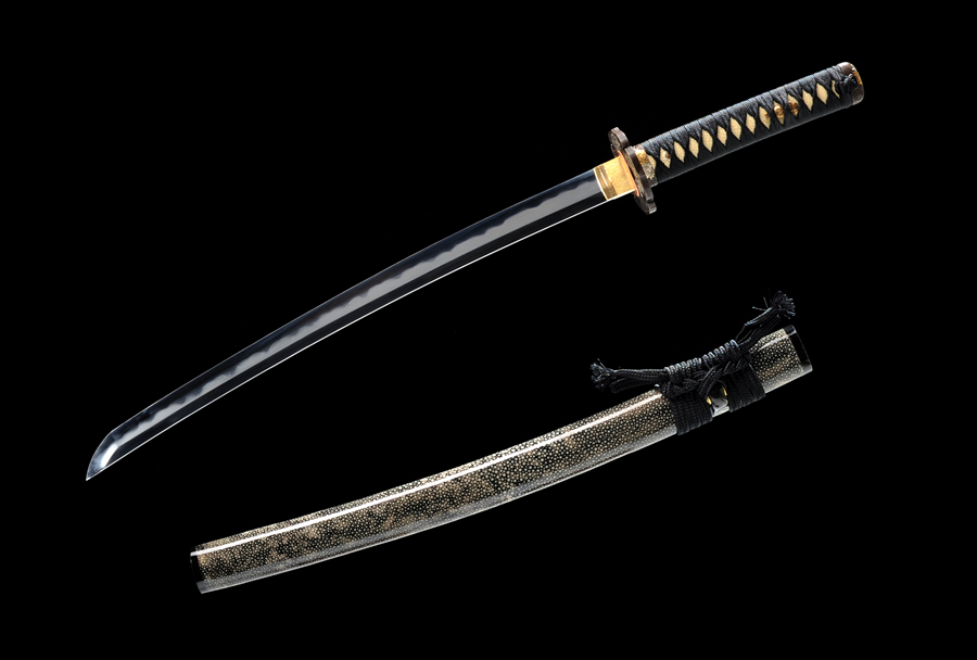 这套武士刀选用自炼钢为皮铁、45#钢芯铁采用古法甲伏锻工艺手工锻造,经敷土烧刃