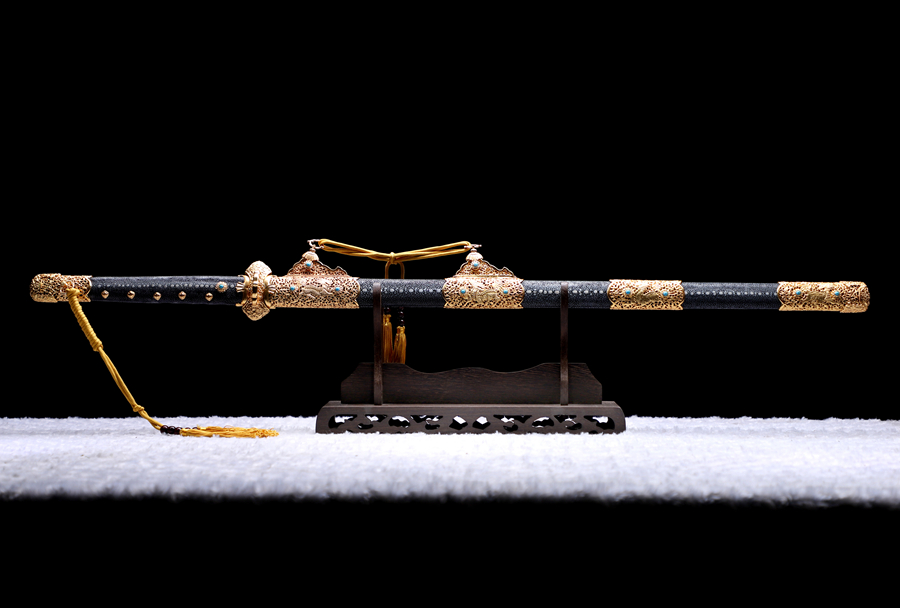剑鞘为重蚁木包珍珠鱼皮(名贵排珠);是一款集收藏价值、观赏价值、实用性能为一身的宝刀。