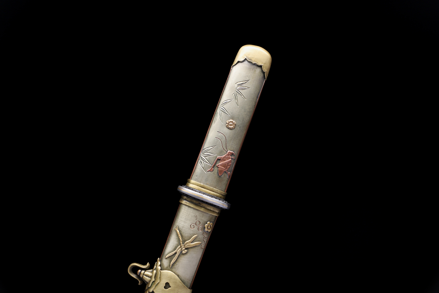 纯手工精细研磨、上研;刀柄及刀鞘为木芯外包精雕白铜及黄铜;