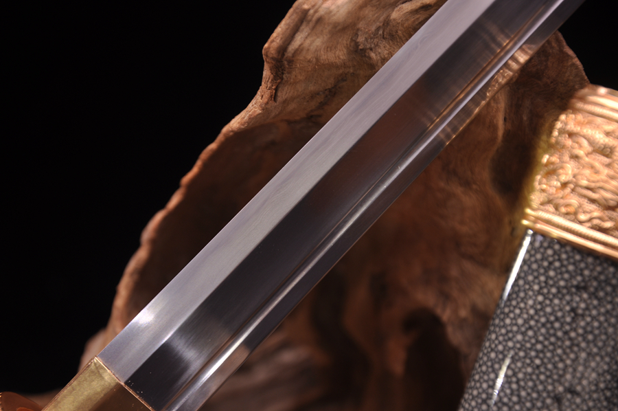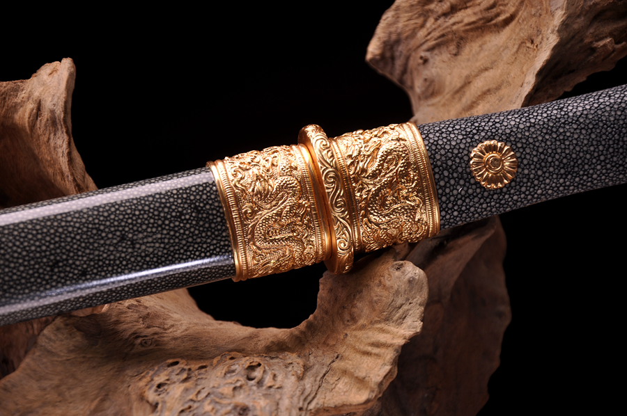 刀柄刀鞘为木胎包珍珠鱼皮;装具为黄铜精雕镀24k真金;是赠送亲密爱人的不二之选。