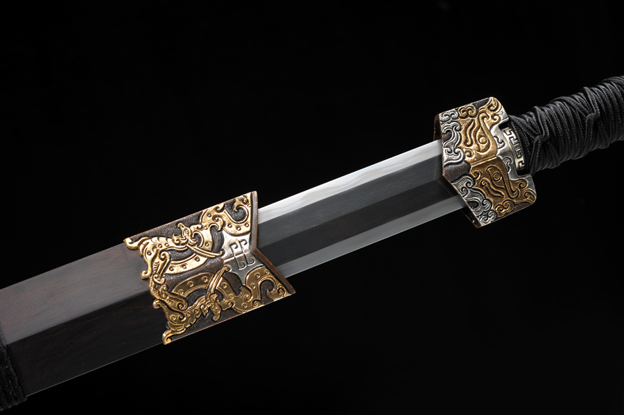 精品系列之精雕八面汉剑:本作品采用地肌精炼钢夹钢工艺全手工锻制而成,