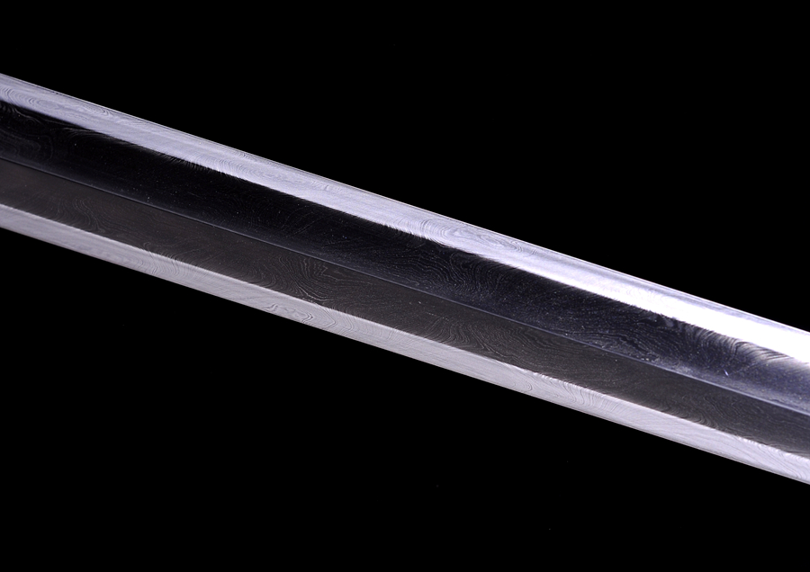 剑身采用扭转百炼钢纯手工锻造,经敷土烧刃,纯手工精细研磨,刃区研白;