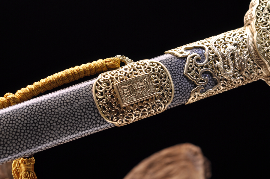 剑装为镂空精雕黄铜制;剑鞘为脱水重蚁木包裹一级珍珠鱼皮;