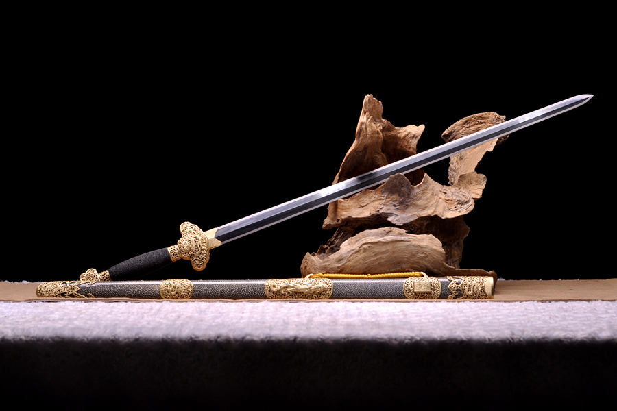 剑身采用地肌精炼花纹钢纯手工锻制,经古法淬火、回火,纯手工精细研磨;
