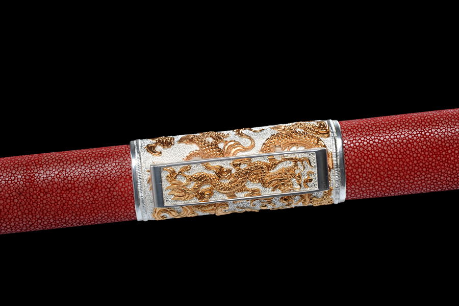 剑装采用黄铜手工精细雕刻而成,鎏24K真金;剑鞘为重蚁木包裹珍珠鱼皮;整剑修长,豪华大气。