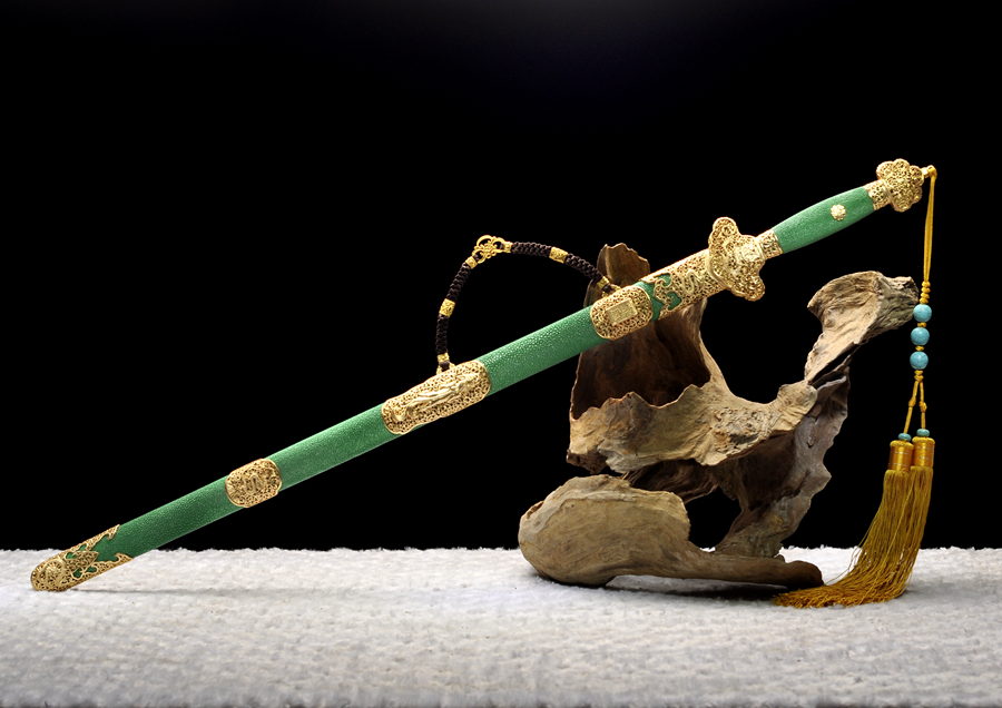 十三道手工精细研磨;剑鞘为重蚁木珍珠鱼皮;剑装为黄铜镂空镀真金,金龙闪耀;整剑华丽且风格独特个性。