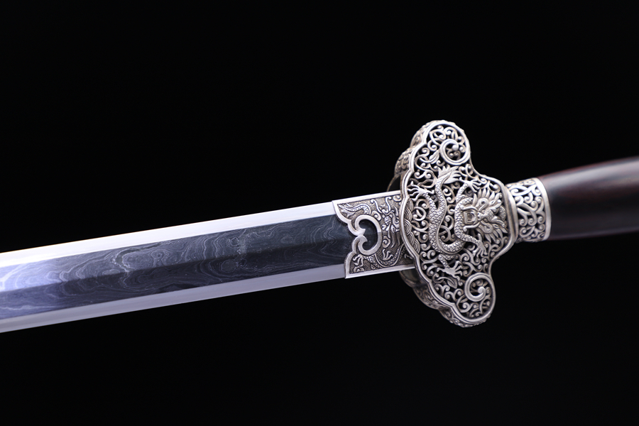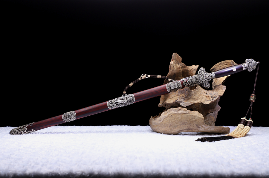剑装为纯银纯手工浮雕、镂空真龙及串草;剑柄及剑鞘选用上品紫檀老料制作。
