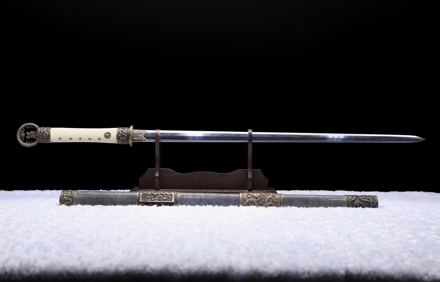 剑鞘采用龙凤檀包珍珠鱼皮;剑装为黄铜精细浮雕;