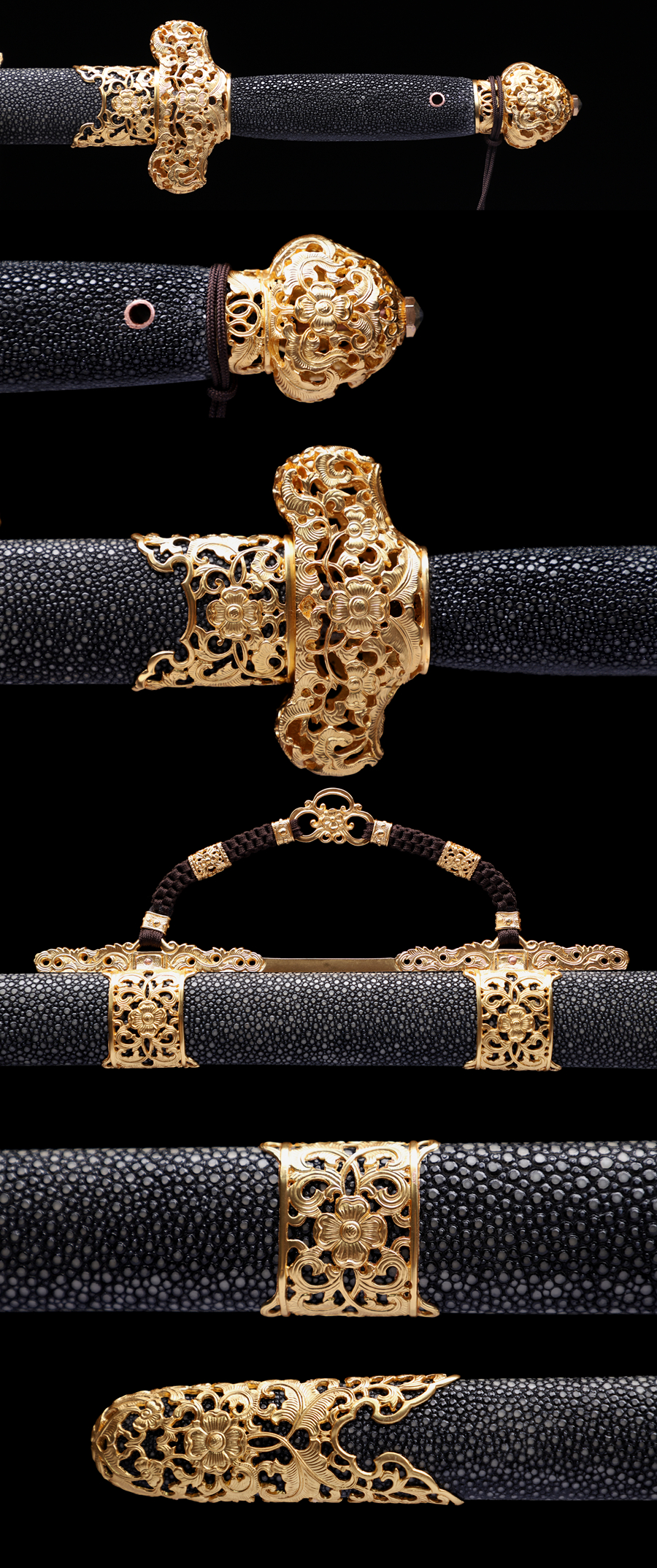 剑鞘采用龙凤檀包珍珠鱼皮;剑装为黄铜透空精雕镀24K金;
