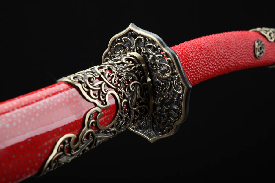 装貝:纯铜镂空精雕--做旧。刀鞘:鱼皮鞘。