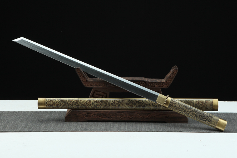 刀鞘刀柄采用纯铜手工包铜、刻花,将木梢用铜皮包上后起到防潮防湿、禁锢剑装作用、