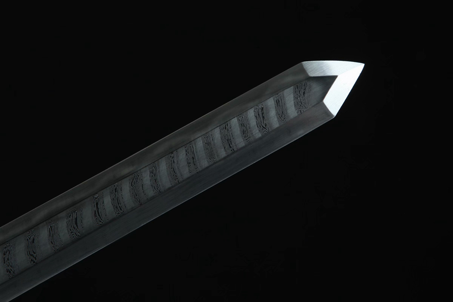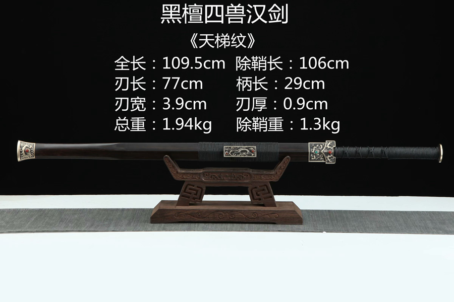 全长:109.5cm 除鞘长:106cm刃长:77cm 柄长:29cm刃宽:3.9cm 刃厚:0.9cm总重:1.94kg 除鞘重:1.3kg装貝:纯铜精雕、精细打磨、做旧;剑鞘:优质黑檀木;剑身:百炼花纹钢、手工锻造成天梯纹、六面几何设计、古法覆土烧刃、精细手磨13222500。(值得珍藏!)