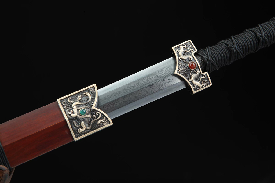 全长:109.5cm 除鞘长:106cm柄长:29cm 刃长:77cm 刃宽:3.9cm 刃厚:0.9cm总重:1.94kg 除鞘重:1.3kg装具:纯铜精雕、做旧、镶嵌真玉石;剑鞘:优质酸枝木;剑身:百炼花纹钢、手工锻造、精细手磨11801250。花纹钢烧刃另加155。