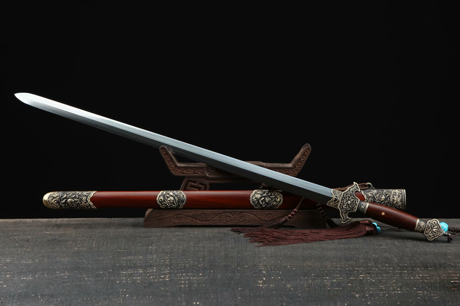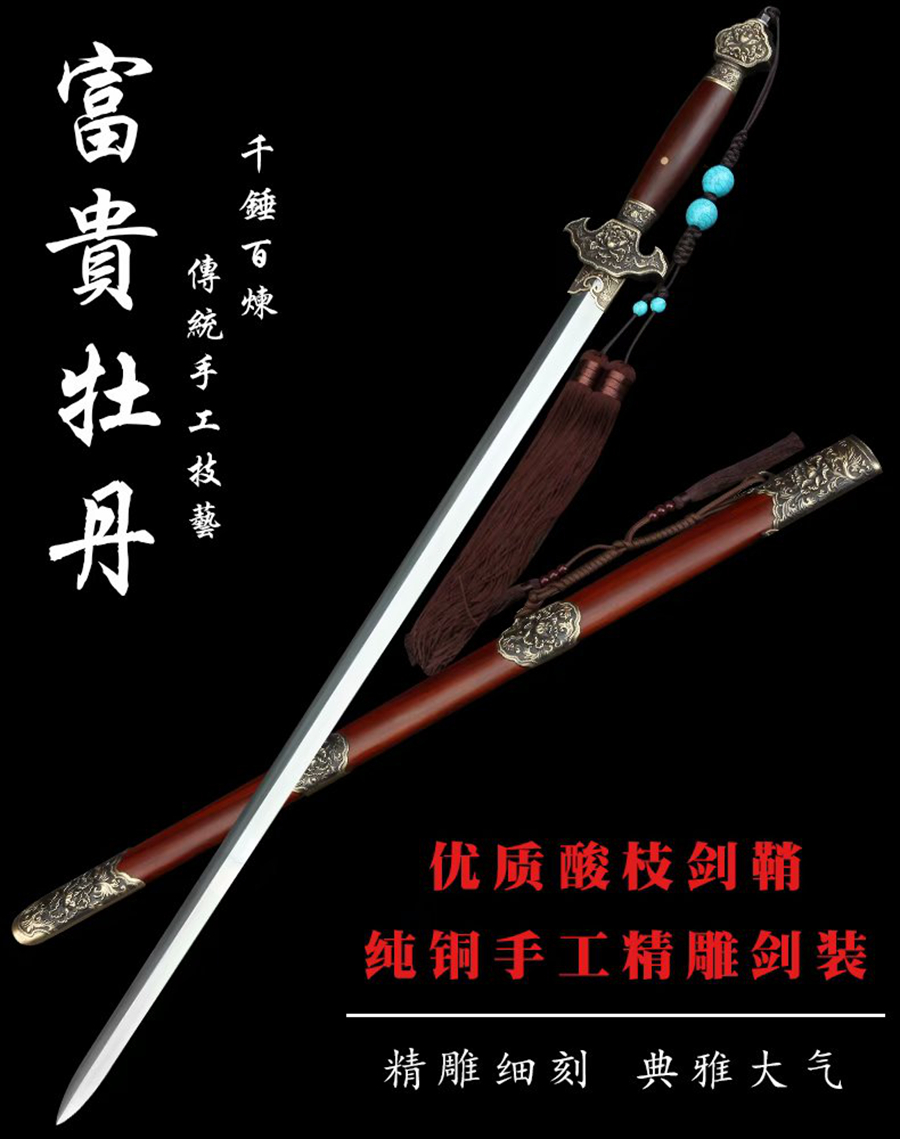 全长:102cm 除鞘长:97cm柄长:22cm 刃长:75cm刃宽:3.5cm 刃厚:0.9cm总重:2.15kg 除鞘重:1.28kg富贵牡丹剑(酸枝木款)。装具:纯铜精雕、古法做旧;剑鞘:优质酸枝木;剑身:百炼花纹钢、手工锻造、精细手磨11551070。花纹钢烧刃另加155。