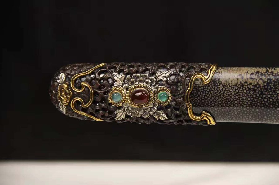 全长:103cm 除鞘长:101 cm刃长:77cm 柄长:11cm刃宽:3.5cm 刃厚:0.9cm总重:2.03kg 除鞘重:1.32kg鎏金银咏春。 装貝纯铜镂空精雕、鎏金银、镶嵌玉。鱼皮剑鞘、八面剑身花纹钢02155500、花纹烧刃加155、羽毛纹烧刃加625