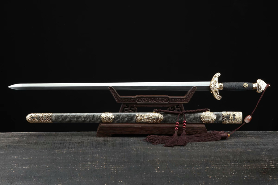 剑鞘:龙泉木包鱼皮;剑身:百炼花纹钢、精细研磨 04503250、花纹钢烧刃另加155.羽毛纹烧刃另加625。