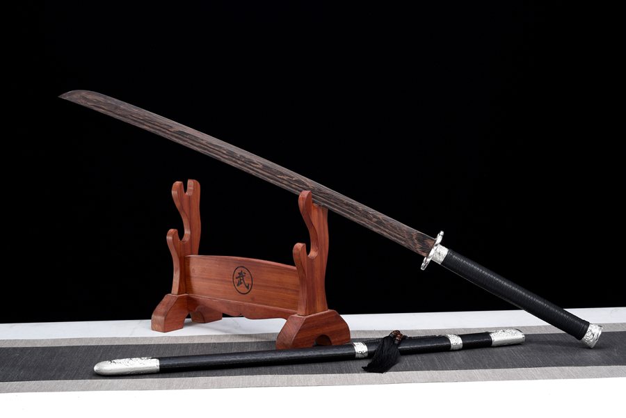 黄金比例设计全长112厘米,柄长33厘米采用防滑蜡绳缠带法手感舒适,刃长73厘米,刃宽4厘米,刃厚0.5厘米,采用花梨木一体开双槽设计,鞘材实木外包PU皮,