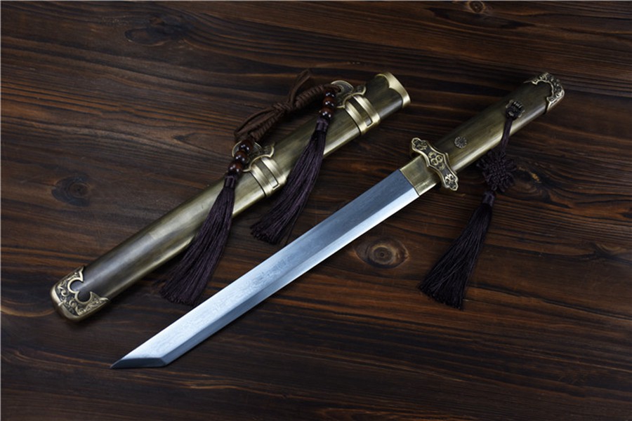 工艺:龙泉传统手工包铜,将铜皮包到鞘上起到保护和禁锢作用,既美观而且不会因为天气潮湿干燥引起的收缩开裂