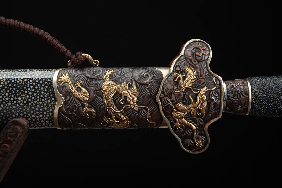装具:纯铜精雕、古法鎏金银;剑鞘:硬木包鱼皮—黑色、