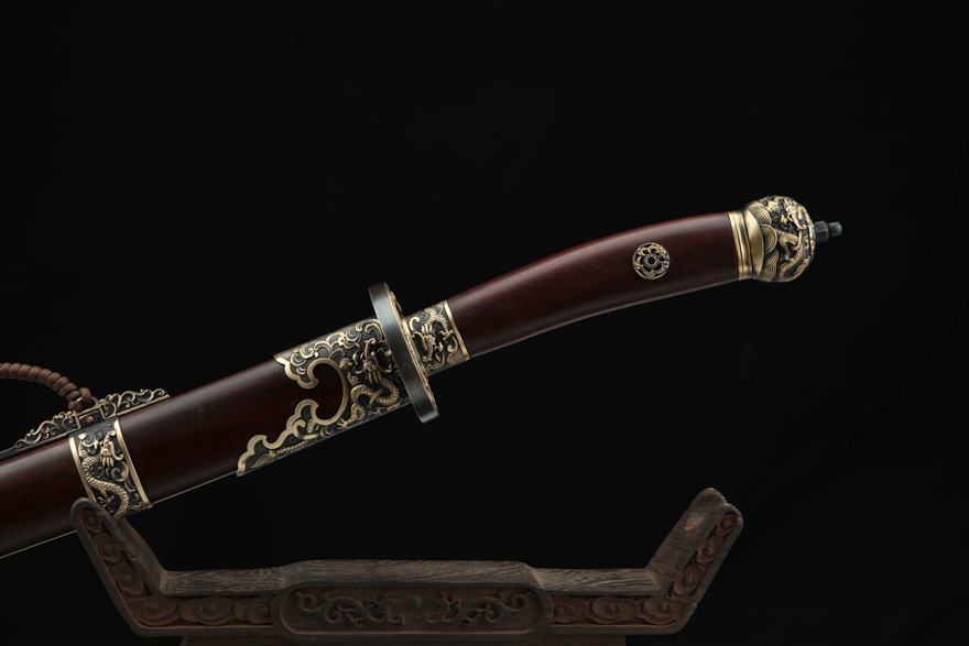 装具:纯铜精雕、精细打磨、做旧;剑鞘:优质酸枝木;