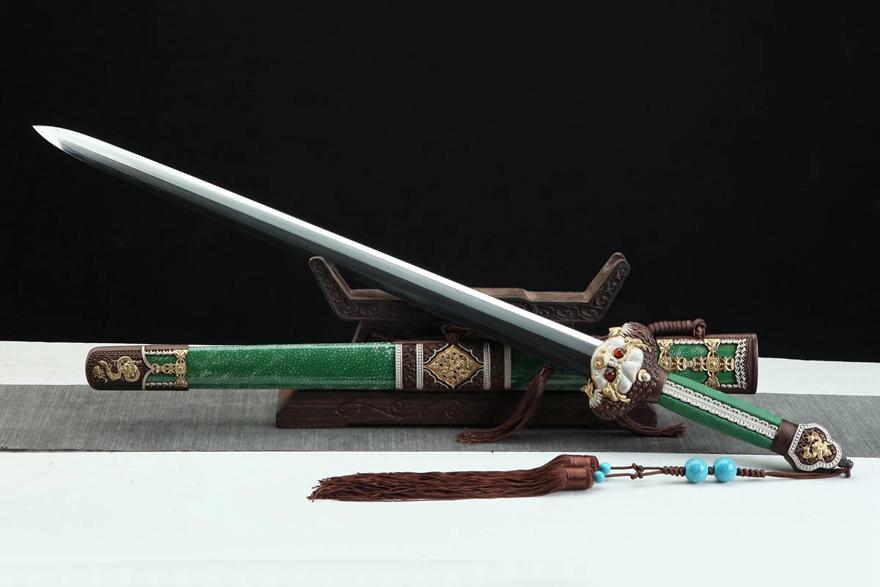 剑鞘:包绿色真鱼皮;剑身:百炼花纹钢、手工锻造、精细手磨20013570。花纹钢烧刃另加125。