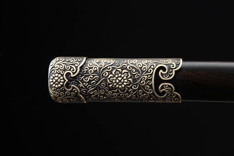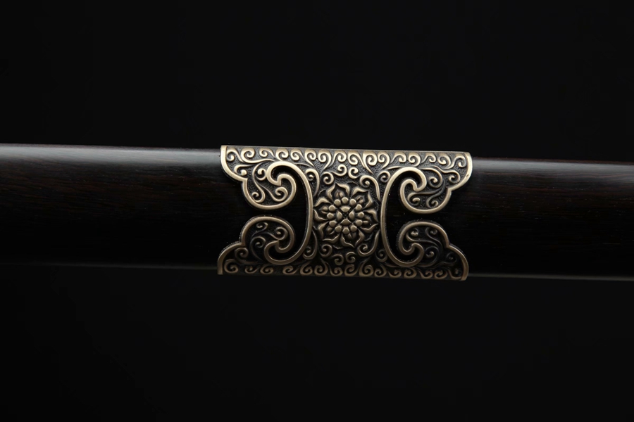 装具:纯铜精雕、精细打磨做旧;剑鞘:优质黑檀木;