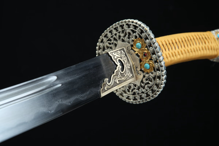 刀鞘:龙泉木包篮色粗颗粒真鱼皮;刀身:百炼花纹钢、精细研磨21855250。花纹钢烧刃另加155。