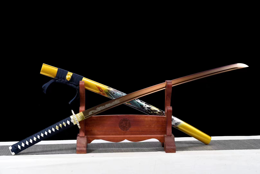 刀刃50#钢煅打,刀身烤金腐蚀雕刻??,全长103厘米,柄长26厘米,刃长71厘米,刃宽3.2厘米,刃厚0.75厘米,传统工艺淬火处理,净重1.22千克,实木大漆彩绘鞘,送高端锦盒
