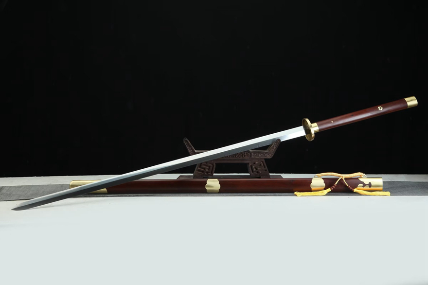 装具:纯铜板手工制作、精细打磨、亮铜;剑鞘:优质酸枝木;