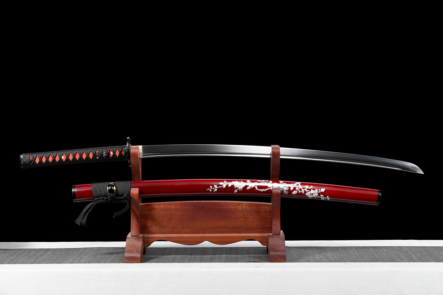 弹簧钢锻打弯曲90度不变形带血槽,硬度高达60°砍铁不伤刃,带鞘全长103厘米,刃长71厘米,柄长26厘米,刃宽3.2厘米,实木大漆仿贝壳鞘,配高端锦盒