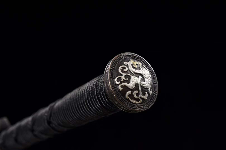 刃材:折叠锻打自练钢(冰裂纹) 装具:黄铜手工雕刻鎏金银 剑鞘:上等紫光黑檀木
