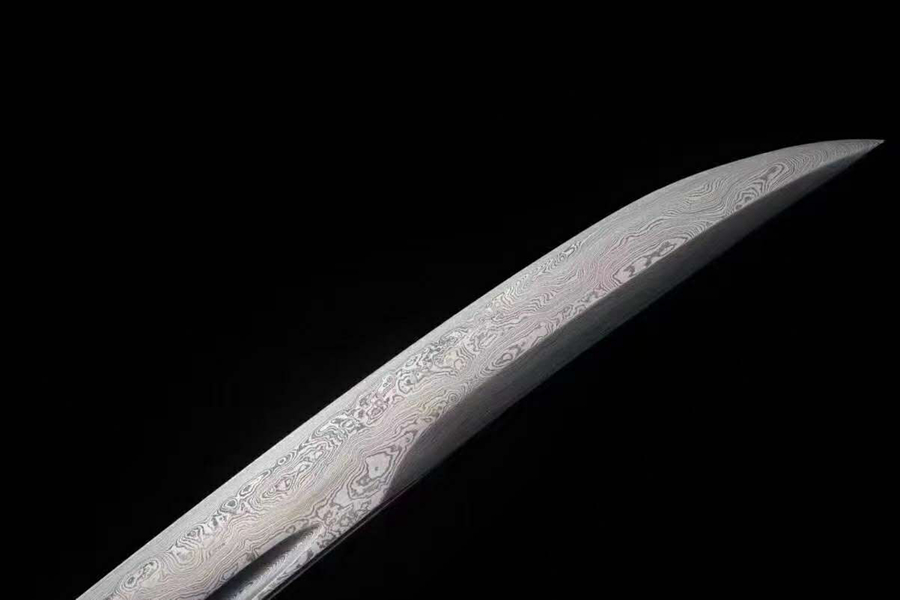 刃材:花纹钢 鞘材:上等黑檀木 装具:纯铜