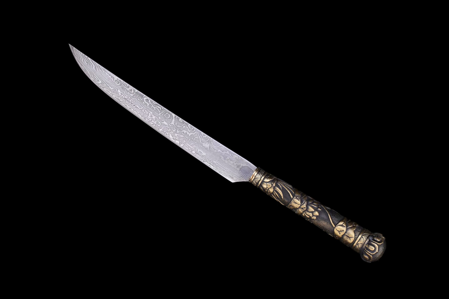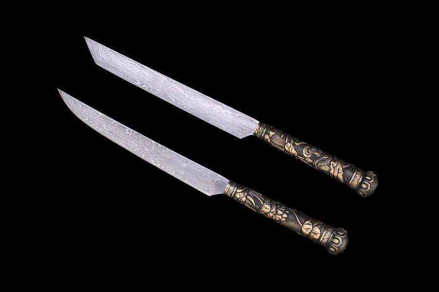 刀身釆用水锈钢材料手工折叠锻打、精细研磨、纹路清晰;刀把用纯铜精雕、有莲花、荷花、鸳鸯图案;