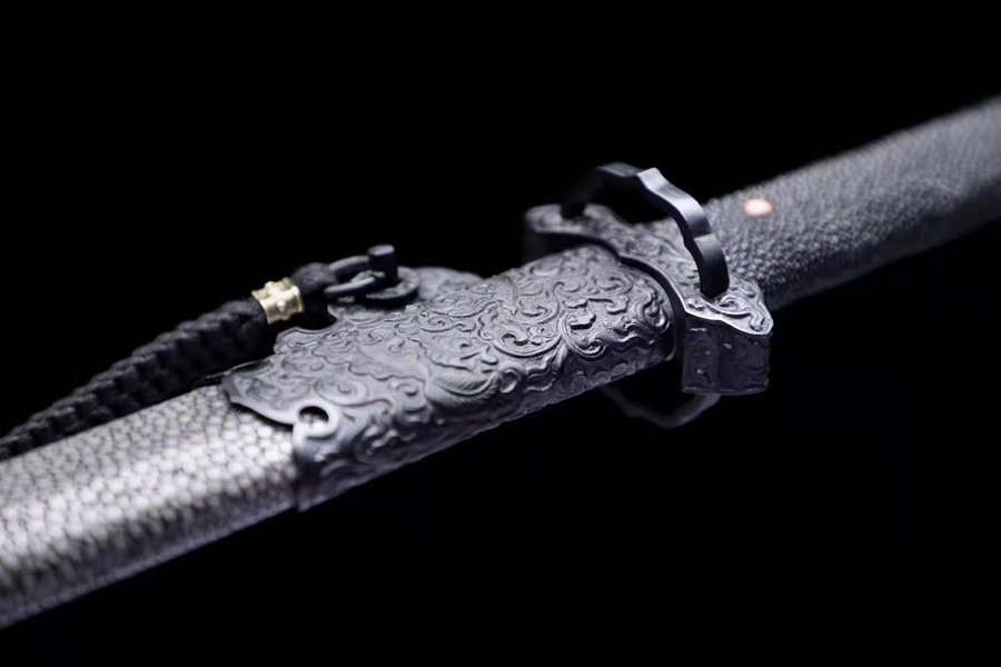 刀装为手工凸花铁雕;刀柄刀鞘采用重蚁木包裹珍珠鱼皮。