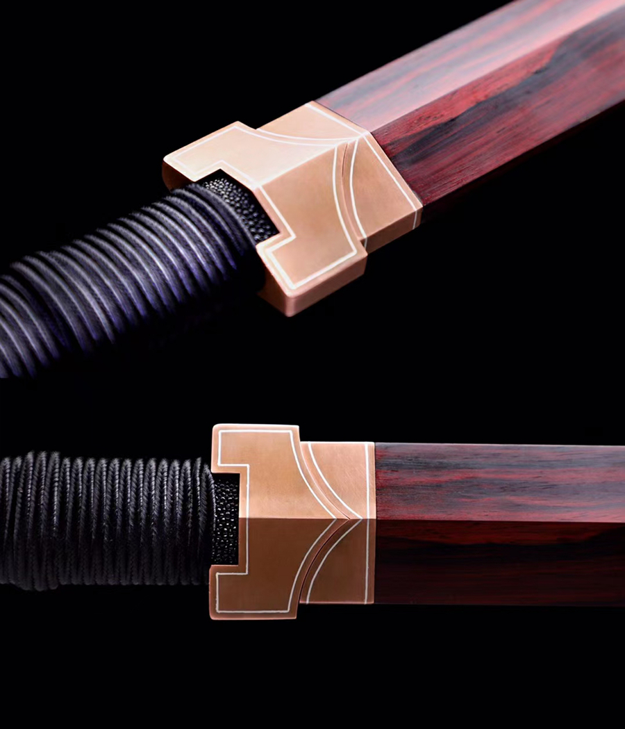 经七星井水淬火,手工精细研磨,上研;剑装为精制紫铜嵌银丝;剑鞘选用上等大叶紫檀。
