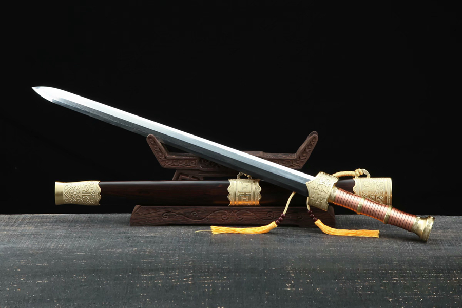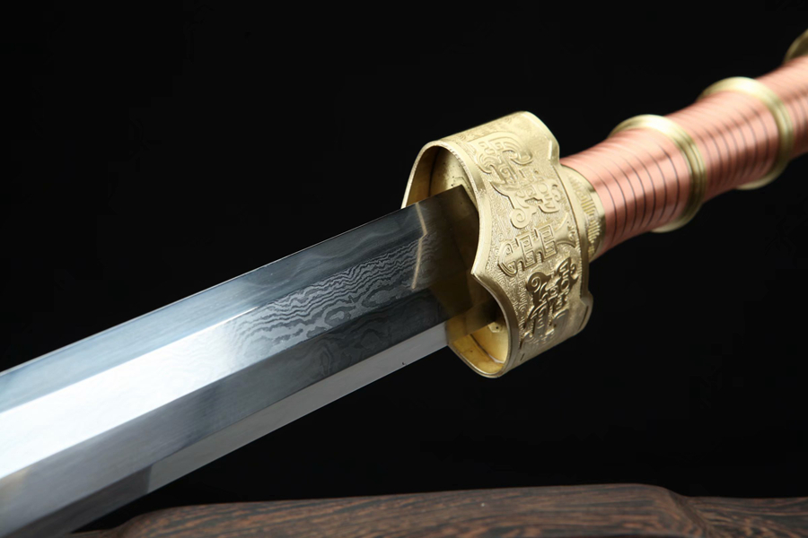 装貝:纯铜精铸、精细打磨、亮铜烤漆;剑柄:纯紫铜与黄铜制作、镶嵌;