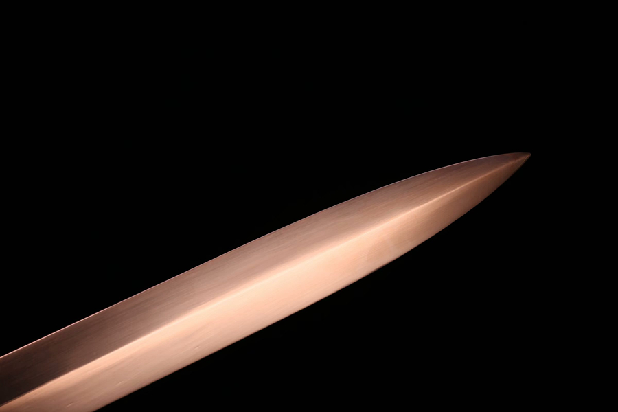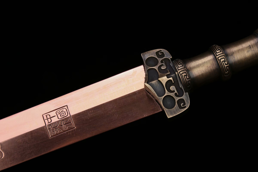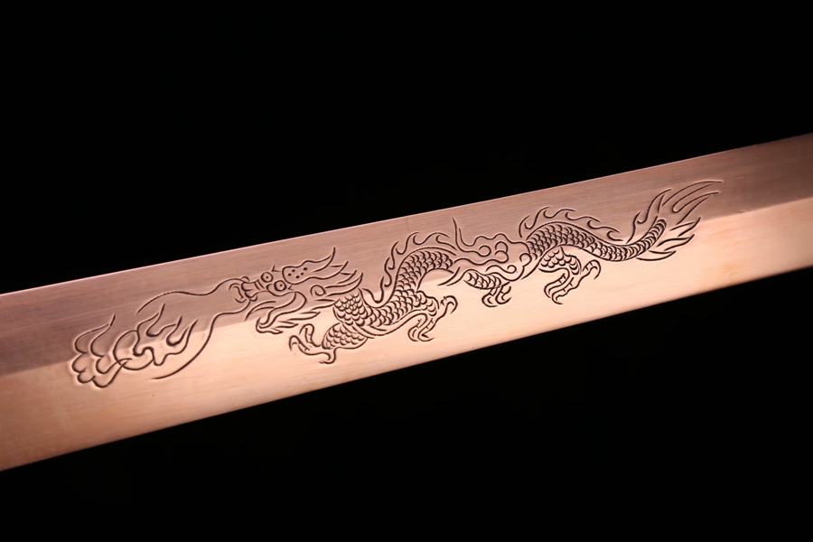 剑把用黄铜精雕做旧;剑身采用紫铜手工锻打、手工铭刻龙、凤图案、